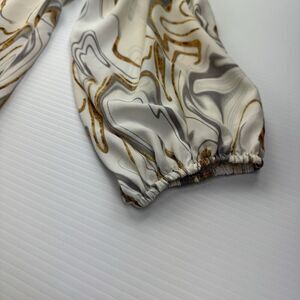 Calstyle Maxi Dress in Geometric Gray White Gold Swirl features a V-neckline, long balloon sleeves, and a pullover closure for easy wear.
