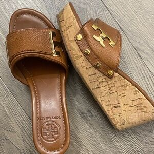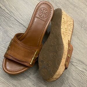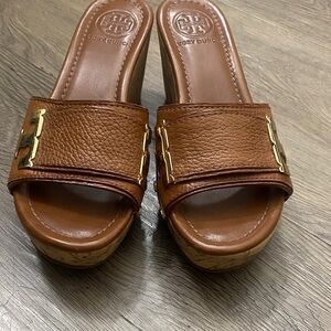 Elegant Tory Burch wedges with tan leather and gold accents. Perfect for stylish comfort.