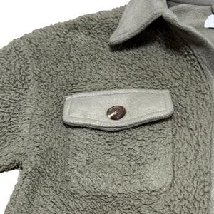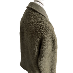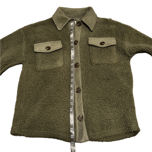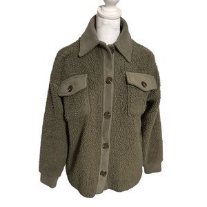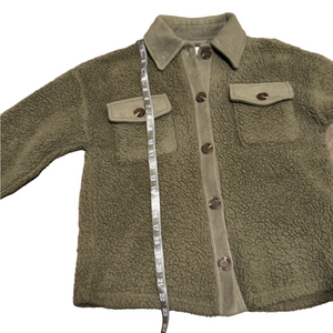 Cozy and stylish olive green sherpa jacket. Perfect for keeping warm and fashionable.