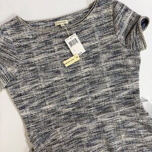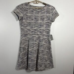 Max Studio Tweed Fit Flare Dress Short Sleeve Textured Blue White Black Sz L NWT