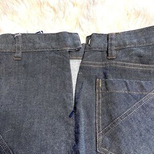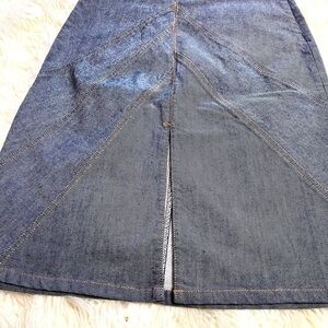 Denim stretch mid skirt with front center slit, detailed stitching, 2 back pockets and side zipper with clasp closure. Size 4 NWT W 30” L 25” See pictures for details.