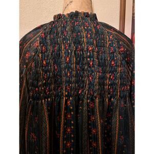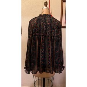Hailey & Co Smocked Print Long Sleeve Tie Neck Blouse Top Size L