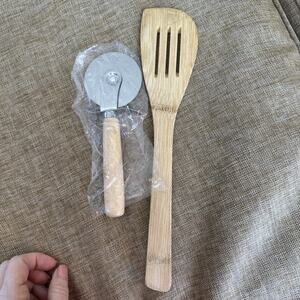 Two Piece Bamboo Cooking Set Spatula Pizza Cutter Slicer Wooden