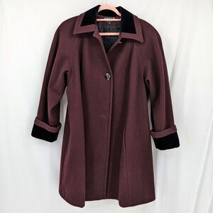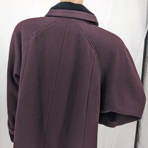Vintage 70s Jofeld wool swing coat. Plum/purple. Button front. Velvet detailing. Structured shoulders. Lined. Pockets. Coat is in good vintage condition with gentle wear to wool such as pilling. Please be aware that this type of wool blend consists of fibers that may appear fuzzy. Please see photos.