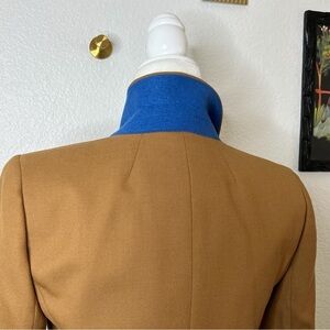 J.Crew camel blazer. Blue wool accent under collar. Stripe lining. Single button.
