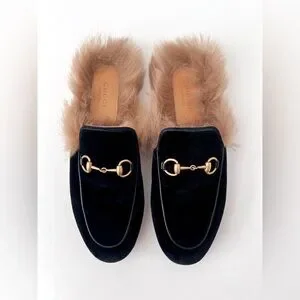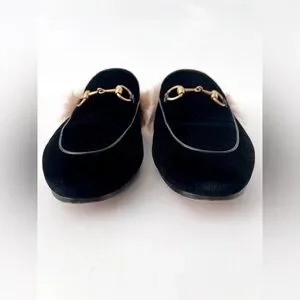 GUCCI || Princetown Fur Black Velvet Horsebit Mules Flats Slides Slippers US 7