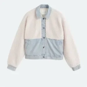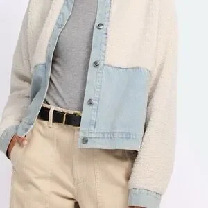Chic jean jacket with soft cream top and blue denim bottom. Button closure. Ideal for layering.