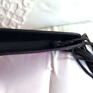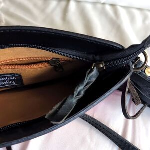 NWOT never used crossbody. It comes with a leather strap and leather fringe on each side of the bag. It is a zip closer on top, with a small inner zip pocket. It can be dressed up or down.
