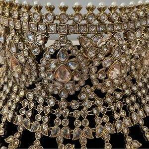 Featuring layers of uncut-style stones, anchored by elegant pearl drops (all faux).