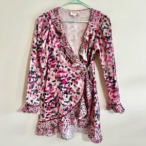 Rococo Sand Pink Long Sleeve Mimi Mini Wrap Dress Sz L. Gently used condition with no notable flaws. Ruffle detailing with shoulder enhancements. Unlined. True wrap dress.