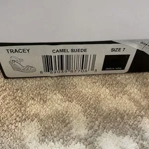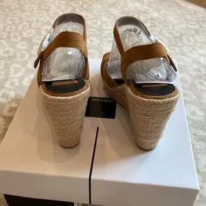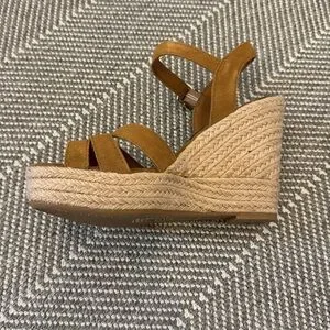Stylish Dolce Vita sandals with a wedge heel. Features a tan suede upper and adjustable ankle strap. Perfect for casual outings.