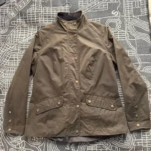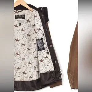 A countryside classic with a collectible twist, this limited-edition Barbour x Emily Bond Ferndown Wax Jacket pairs Barbour’s signature weather-proof waxed cotton with a charming horse-and-hound printed lining by British designer Emily Bond. The tailored silhouette flatters while keeping you dry, with brass snap buttons, corduroy collar, and a tartan-trimmed storm flap for timeless style. Price is firm.