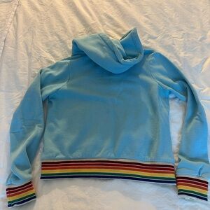 Light blue hoodie with front zipper. Features colorful stripe detail. Comfortable and trendy. Like new. Worn once.