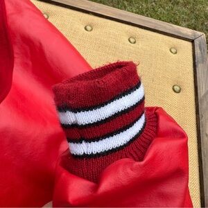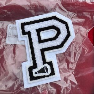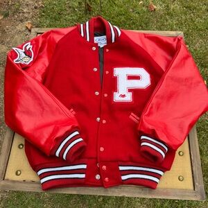 Stylish red varsity jacket featuring a bold 'P' & Vikings patch and striped cuffs. Perfect for casual wear. Also I have additional P patch to attach.