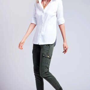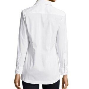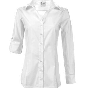 Casual yet tailored white button down shirt for women in a crisp, high thread count cotton/spandex blend