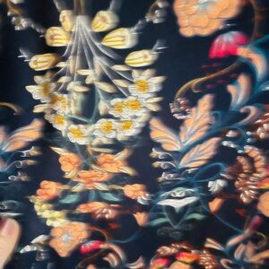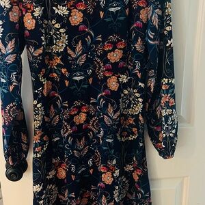 Chic navy dress with vibrant floral design. Features long sleeves and elegant patterns. Great for a bridal or baby shower!