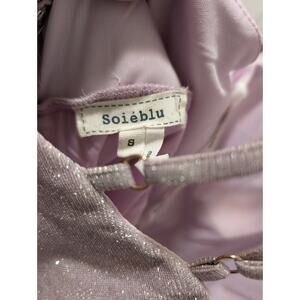 The Soieblu Glitter Blush Pink Silver Shimmer Halter Strappy Party Mini Dress in size S is a stylish and glamorous option for weddings or parties. The dress features a solid pink color with silver glitter accents, giving it a luxurious and eye-catching look. With a sleeveless design, halter neckline, and zip closure, this dress is perfect for summer or spring events. The polyester material and lining ensure a comfortable and flattering fit, while the adjustable features add a personalized touch to the overall ensemble. Perfect for a night of glamour and fun.