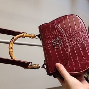 Beautiful, gently used, croc skinned, burgundy/maroon colored crossbody purse with a bamboo like material handle. The strap can be removed and is adjustable for the length as well. The bag measurements are 7x9 inches as the photos show. There is 1 pocket in the back of the purse (no button or clasps, and there is a smaller pocket inside the purse (no zipper, buttons, or clasps). The main closure is a magnetic snap. EUC! No flaws noticed. Comes from a smoke-free home. Please ask any questions before buying. Make an offer or bundle more than 1 of your likes from my closet for a discounted price! 😉