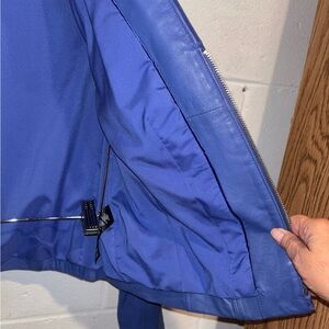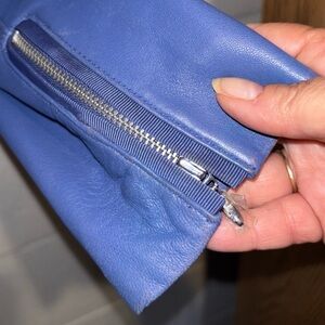 Blue leather zip up motorcycle jacket zipper pockets
