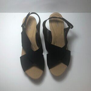 CLARKS Annadel Eirwyn Wedge Sandals Women's Size 11 Black Slingback Leather