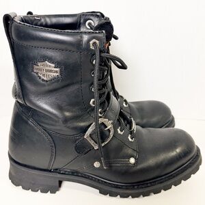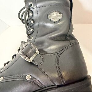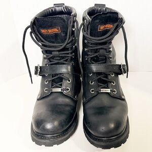 Rugged black boots with lace-up design. Features Harley-Davidson logo. Ideal for tough wear.