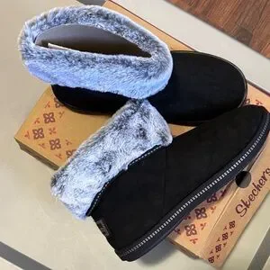 Chic black boots with cozy gray faux fur trim. Ideal for winter wear. New in box