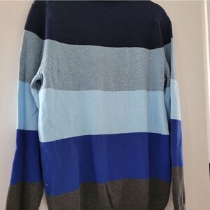 NWT! Club Room Men’s Striped Crewneck Sweater pullover style, crewneck features color-block design with stripes in various shades of blue and gray.