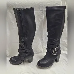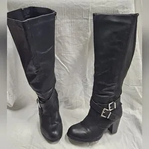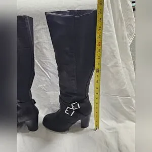 Step out in style with these sleek black knee-high boots. Perfect for any occasion, they feature a chic buckle detail for added flair.