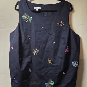 Chic navy blouse. Sleeveless style. Adorned with vibrant embellishments. Different bugs made out of sequins and jewels cover the top.
