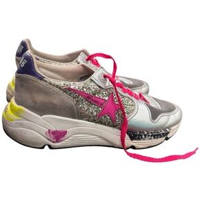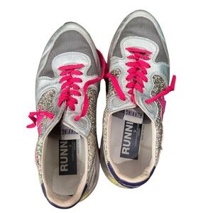 Chic Golden Goose sneakers with silver and red highlights. Features a unique star design and vibrant laces. Size 8.5