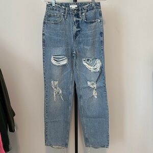 Stylish distressed jeans. Classic blue denim. Perfect for casual wear.
