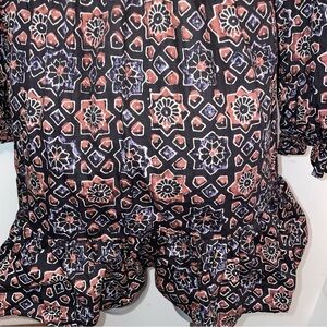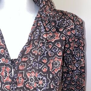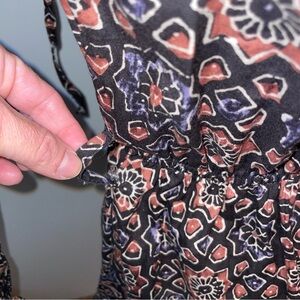 Walter Baker Dress mini ruffle multicolor cotton brown black blue geometric small. Stylish bohemian dress by Walter Baker. Features intricate patterns in black, brown and a smoky gray blue. Stunning. Dress has belt loops but no belt.