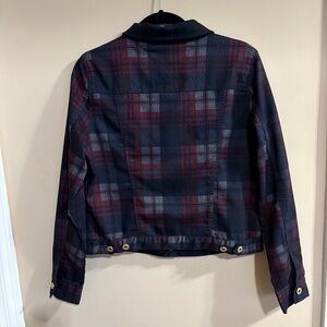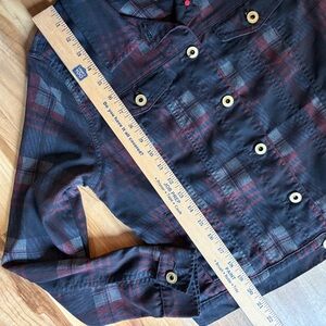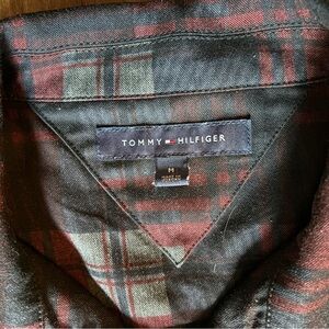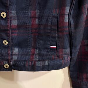 Classic plaid lightweight trucker jacket by Tommy Hilfiger. Features a bold black and red pattern. Ideal for casual wear. This is in the style of a jean jacket but a much lighter weight fabric. Great for layered looks.