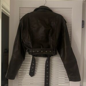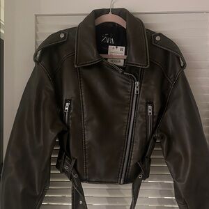 Stylish Zara leather jacket with a biker design. Features a belted waist and zip details.