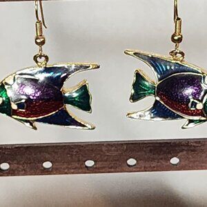 Unsigned Red Green Blue Enamel Gold Tone Angel Fish Dangle Earrings Pierced Ears