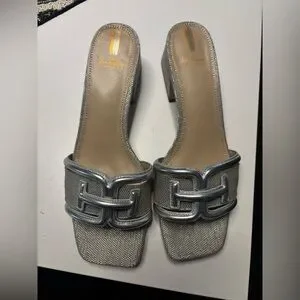 Chic silver mules with a textured finish. Stylish and comfortable for any event.