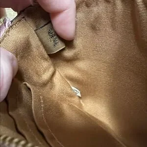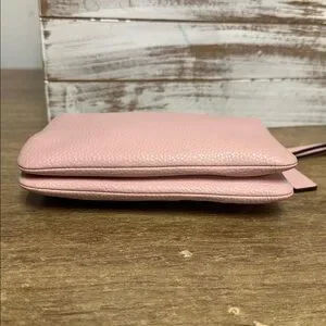 Authentic with no visible flaws - Coach great shape double corner sectional brown fabric interior multi slip card pocket storage light pink pebbled leather dual zip top wristlet wallet. Wrist strap 6”. Measurements: 6.5 X 1 X 4”