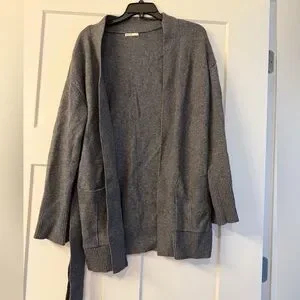 Chic and cozy charcoal cardigan. Features a belted waist and long sleeves. Ideal for layering.