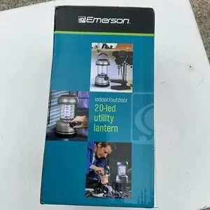 “New” (Set of 2) Emerson 20-LED utility lanterns for indoor and outdoor use. Features a sleek black and gray design. In-Opened-In Boxes! Built In DimmerSwitch For Soft Accent Lighting, Or Bright Reading Light. Convenient Fold-Down Handle For Carrying And Hanging.