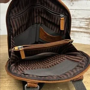 Authentic with minimal wear and no visible flaws - Jack Georges great shape voyager brown smooth leather convertible breathable mesh grey buckle straps silver hardware zip around closure exterior zip pocket interior brown stripe fabric multi storage slip pen pencil pockets compartments travel school medium unisex women’s men’s backpack pouch. Measurements: 11.5 X 2.5 X 12”