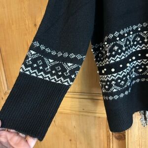 Elegant black sweater with intricate white pattern. Embellished with faux diamond and pearls accents. Super soft. Slight stretch. Beautiful in person. Perfect for fall and winter parties.