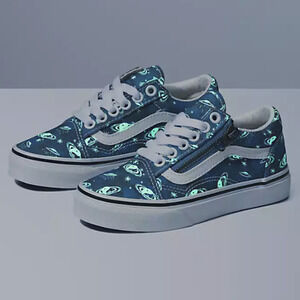 The Cosmic Glow Kids Old Skool Zip combines the legendary Vans sidestripe shoe with a zipper entry down the eyelets, offering increased access and versatility. Along with sturdy textile uppers featuring a glow-in-the-dark outer space print, this sleek take on our iconic low top shoe also includes reinforced toe caps, supportive padded collars, and signature rubber waffle outsoles.
