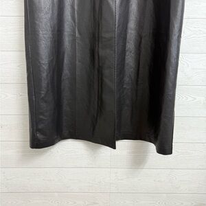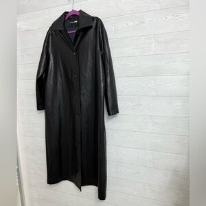 Black faux leather maxi oversized trench coat with black button down front closure and foldable lapel collar. Size L S2S 22” P2P 24” LO 52” SL 22” NWT See pictures for details.