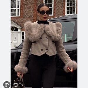 Brown Double Breasted Cropped Jacket With Fur Collar Embellishment