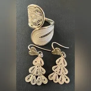 Set of Vintage Sterling Silver Intricate Filigree Ring & Earrings from Malta