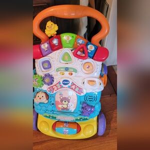 Engage your child with this colorful interactive learning walker. Featuring vibrant orange, green, and blue colors, it offers musical fun and educational activities. Perfect for developing motor skills and learning through play.