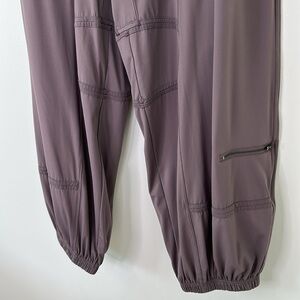 Stylish purple track pants. Relaxed fit with zipper details. Perfect for active wear.