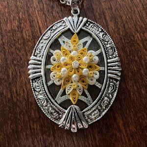 This elegant costume jewelry set features a beautifully crafted silver necklace and matching clip on earrings with intricate yellow floral designs. Perfect for adding a touch of sophistication to any outfit.