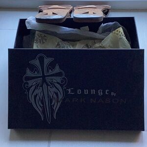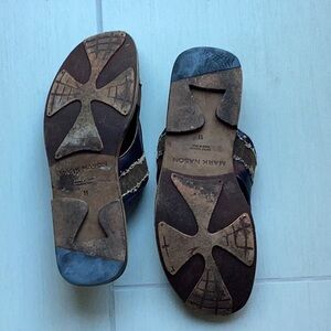 Slip on leather sandals with embossed leather and metal accents. Brown leather with a blue metallic wash. Comes with original box.