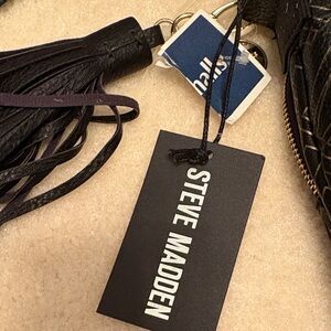 Chic Steve Madden crossbody with bold logo design. Features black and gold accents. Ideal for everyday use.